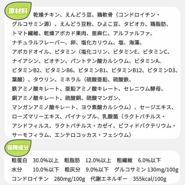 チキンミール、えんどう豆、鶏軟骨(コンドロイチン・グルコサミン源)、えんどう豆粉、ひよこ豆、タピオカ粉、鶏脂肪、乾燥トマト繊維、アボカドミール、亜麻仁、アルファルファミール、ナチュラルフレーバー、乾燥全卵、塩、塩化カリウム、ビタミン(塩化コリン、ビタミンE、ナイアシン、パントテン酸カルシウム、ビタミンA、ビタミンC、ビタミンB6、ビタミンB1、ビタミンB2、ビタミンB12、ビタミンD3、ビオチン、葉酸)、ミネラル(硫酸亜鉛、アミノ酸亜鉛キレート、硫酸鉄、硫酸マンガン、アミノ酸マンガンキレート、硫酸銅、アミノ酸銅キレート、亜セレン酸ナトリウム、ヨウ素酸カルシウム)、アボカドオイル、ローズマリーエキス、セージエキス、パイナップル、納豆菌発酵抽出物、アスペルギルス・オリゼー発酵抽出物