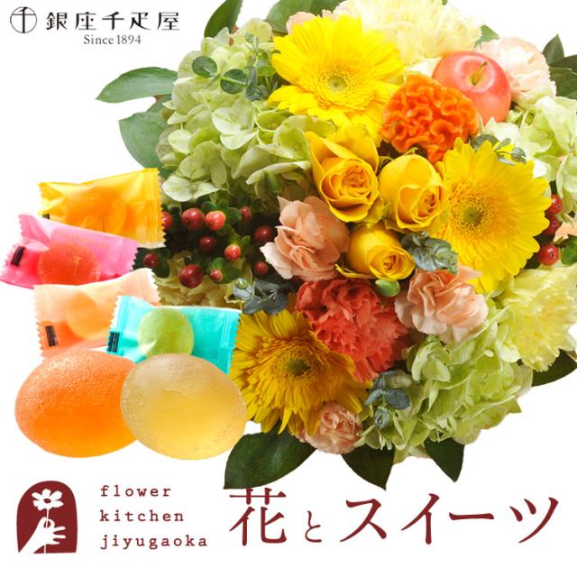 花とスイーツのセット ラウンドアレンジ「イエロー」+【銀座千疋屋】ひとくちフルーツゼリーセット プレゼント 誕生日 記念日 お祝い花 即日発送 あすつく メッセージカード FKAASW