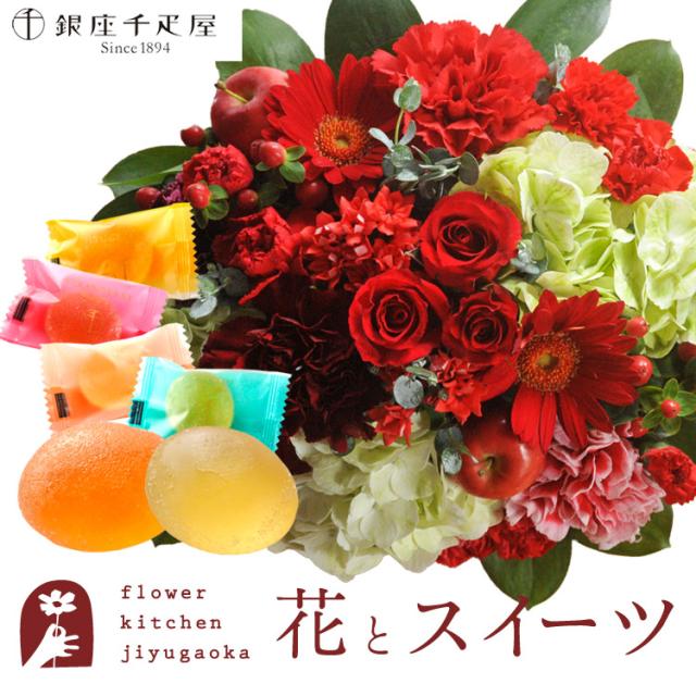 花とスイーツのセット ラウンドアレンジ「レッド」+【銀座千疋屋】ひとくちフルーツゼリーセット プレゼント 誕生日 記念日 お祝い花 即日発送 あすつく メッセージカード FKAASW