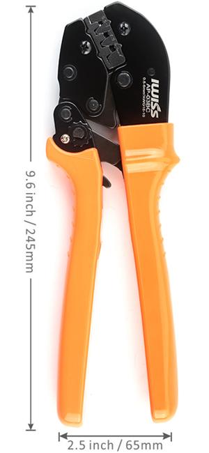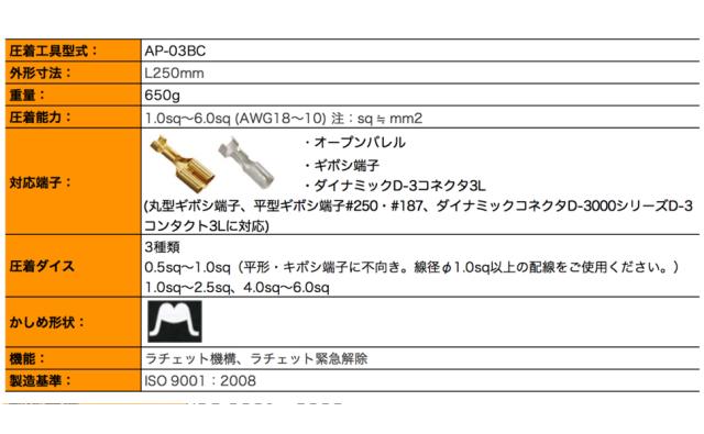圧着能力:0.5-6.0mm?(AWG20-10) *注:mm?≒sq(*重要:ギボシ、平形端子の圧着に使用される場合、線径φ1.0sq以上の電線をご使用ください)