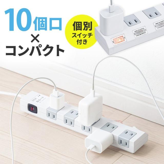 電源タップ 10個口 2m 個別スイッチ 一括集中スイッチ 雷ガード 固定用マグネット付き ホワイト[700-TAP051]