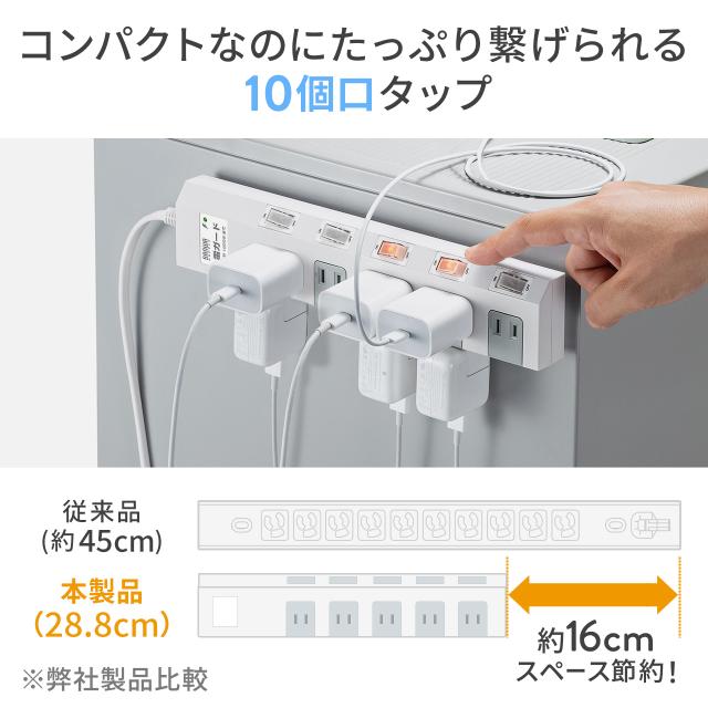 ●10個口の電源タップです。●差込口の間隔が45mmあるので、タブレット用のACアダプタも無理なく差し込めます。