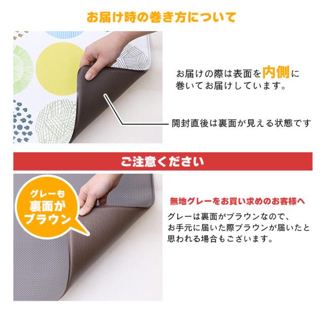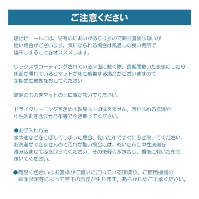 備考 開封後は新品の為においが強い場合がございます。 こちらのにおいは、時間の経過により消えていきますのでご安心下さい。 もし、気になるようでございましたら 風通しの良い日陰で干すなどしていただきますようお願い致します。ドライクリーニングを含め本製品は洗えませんので汚れはぬるま湯や、中性洗剤を含ませた布等で拭き取ってください。フローリングワックスが新しい場合(新築の家など)や濡れた床に敷いてしまいますと床に癒着してしまう場合がございますので長期間敷いたままにせず、定期的に敷きなおしてください。