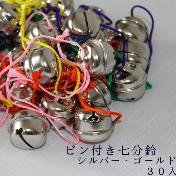 ピン付き7分鈴 30入<サイズ>直径約2.1cm 紐5cm <素材>ブリキ<色>シルバー、ゴールド