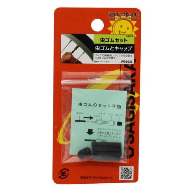 バルブの補修用、虫ゴムとキャップのセット。バルブからの空気漏れは虫ゴムの交換を。