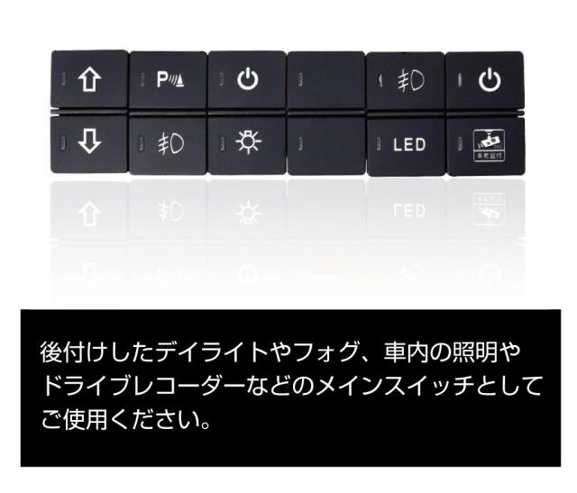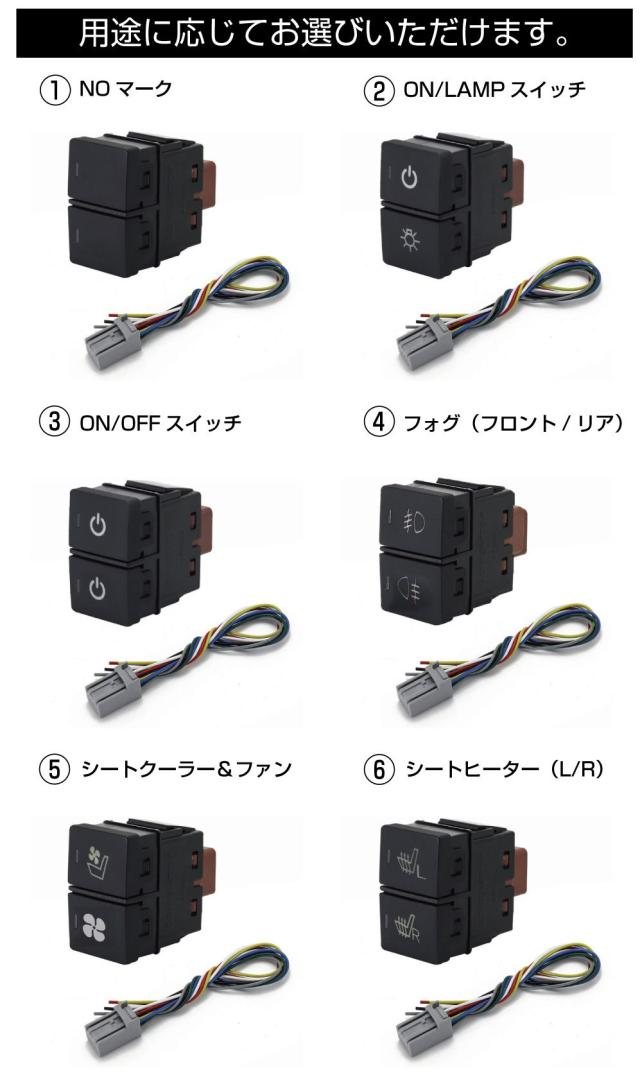 | パターン | 上下:NOマーク / 上下:ON/LAMPスイッチ / 上下:ON/OFFスイッチ / フォグ(フロント/リア) / 上:シートクーラー 下:ファン / シートヒーター(L/R) |