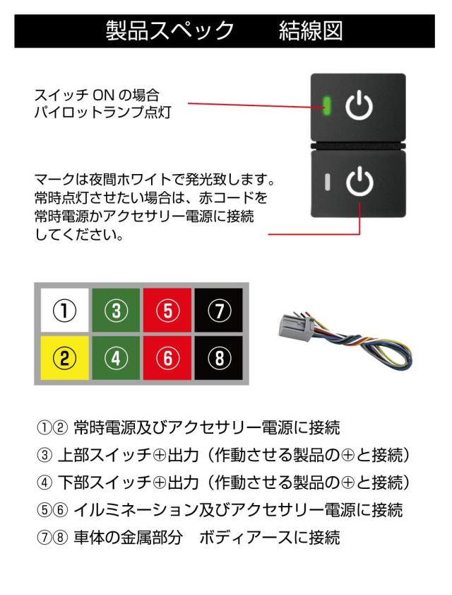 ・ホンダ車の空きポートに取付できる増設用スイッチです。 ・純正風仕上げで後付感を減らし、まるで純正かのようにスイッチを増設できます。 ・後付したデイライトやフォグランプ、ドライブレコーダーのメインスイッチとしてや車内の照明などの電装品のON/OFFスイッチとして使用できます。 ・上下分岐型のダブルスイッチなので一つのポートで2つの電装品のON/OFFが切り替えられるので便利です。 ・使用する電装品の用途に応じて選べる2種類のマークの組み合わせが6パターンから選べます。 |