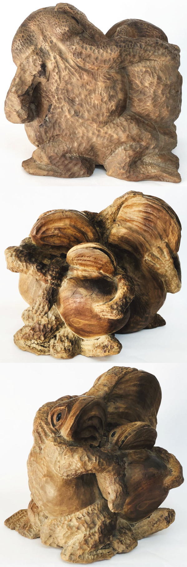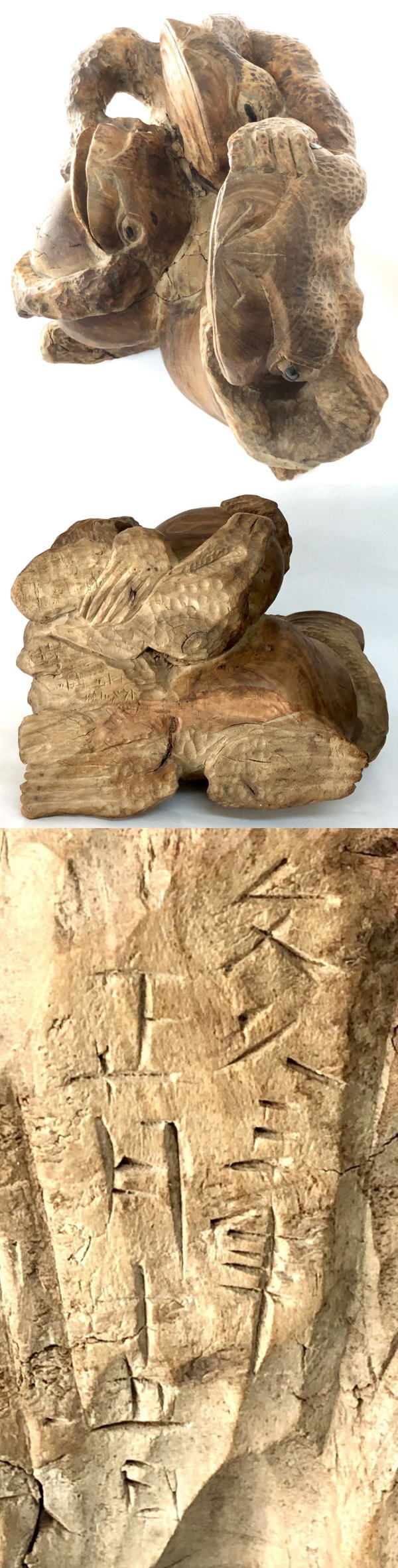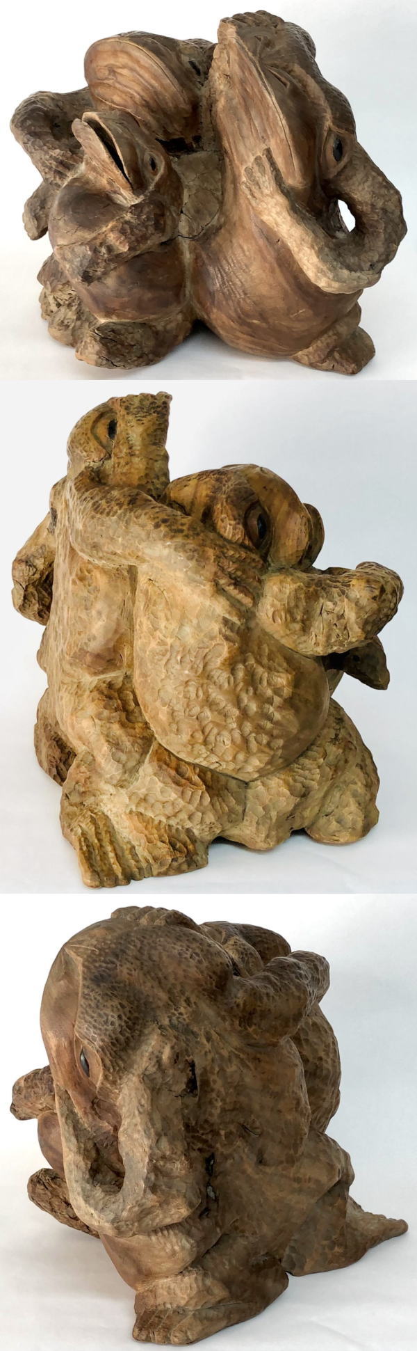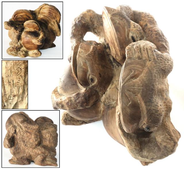 【送料無料】 文久三年 三蛙置物 木彫り 一刀彫り 年代保証 縁起置物 入手困難 古美術 骨董 古玩 古賞物 古美術 日本物 (旧家蔵出し) 威龍彩雲通販