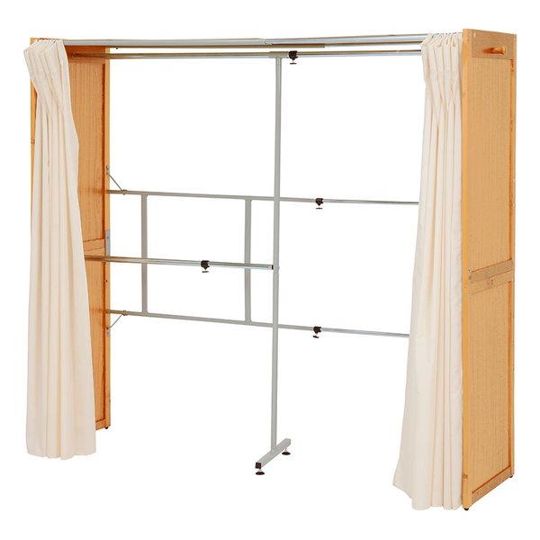 スペースに合わせて伸縮可能な木製クローゼットハンガー。カーテン付き。