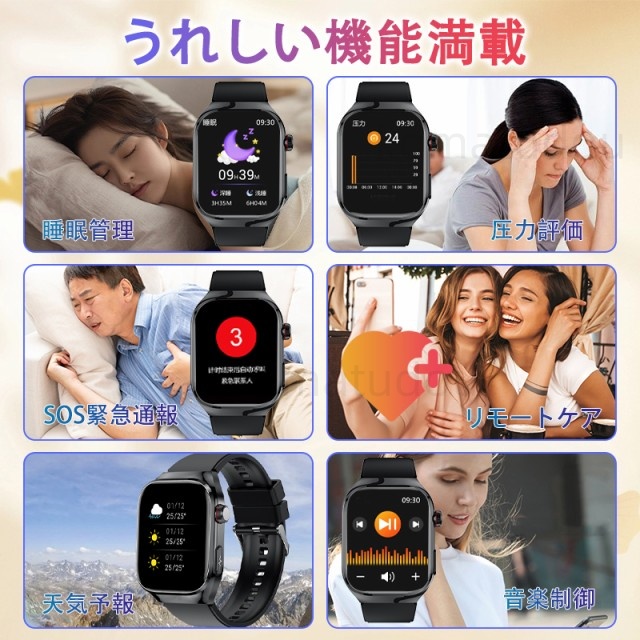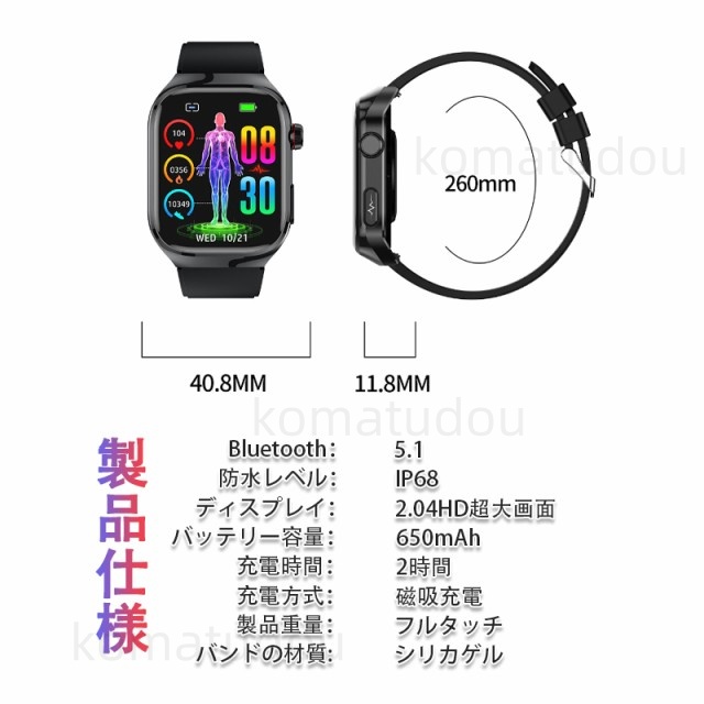 スマートウォッチ 音声通話 心電図 BMI 尿酸値 血中脂質 血中酸素 五臓健康管理 血糖値測定 2.04インチ血中酸素 睡眠検測 着信通知 IP68防水 iphone android 歩数計 心拍計 睡眠測定