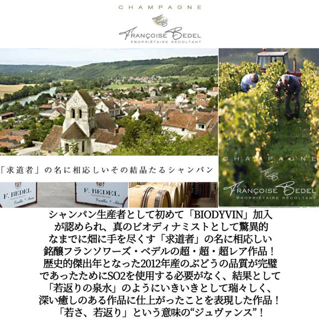 シャンパン生産者として初めて「BIODYVIN」加入 が認められ、真のビオディナミストとして驚異的なまでに畑に手を尽くす「求道者」の名に相応しい銘醸フランソワーズ・ベデルの超・超・超レア作品!歴史的傑出年となった2012年産のぶどうの品質が完璧であったためにSO2を使用する必要がなく、結果として「若返りの泉水」のようにいきいきとして瑞々しく、深い癒しのある作品に仕上がったことを表現した作品!「若さ、若返り」という意味の“ジュヴァンス”!