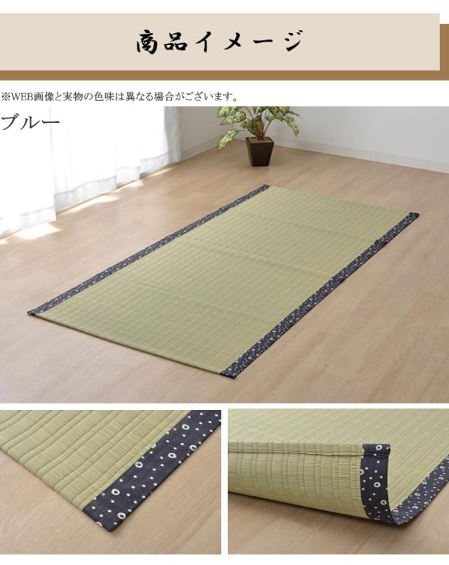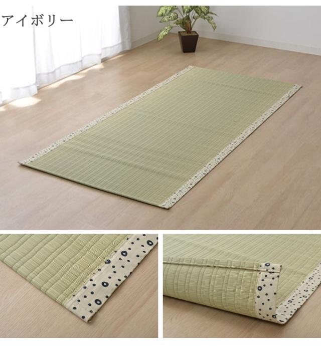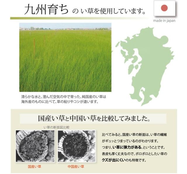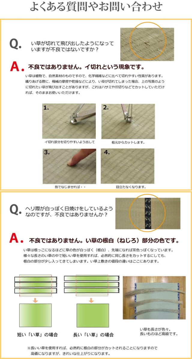 | よくある質問 | ■イ切れについて い草が切れて飛び出したようになっていることがありますが、商品特性上起こりえる「イ切れ」という現象ですので不良品ではありません。(ハサミ等でカットしてください) ■色合いと形状について い草はねぎと同じで根本が白色、中央は青緑色、先端は薄茶色となっており、これを組み合わせているので中央と端の色が異なり日焼けしたように見えていまうことがあります。 また、自然素材ですので、形状のバラツキやサイズが表示と多少異なることがあります。 ■カビについて 新品のい草製品はカビやすいため、できるだけ風通しの良いお部屋でご使用いただき、天気の良い日はお部屋の換気や2時間程度の日陰干しをして下さい。(梅雨時期は除湿器の使用をお勧めします) ■ご使用前に ご使用前に必ず乾いたぞうきんなどで2〜3回から拭きして下さい。 い草に浸透していない染土・塗料・樹脂が表面に付着しているのでそれらを取り除くためです。 その際多少色落ちする事がありますので新しい畳や、色の付きやすい絨毯等の上に敷く場合には新聞紙等を下に敷いて下さい。 ■シワについて 天然素材のためどうしても波打ったようなタタミシワがありますが、ある程度の日数が立つことでなじんできます。(まっ平らにはなりません) |