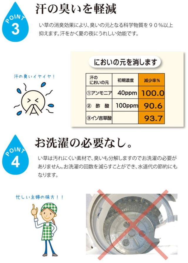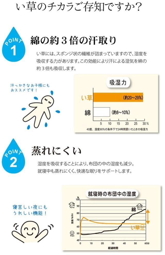 | 特徴 | 国産(九州産)のい草を使用したネゴザ(寝ござ)です。 一本一本が太く、表皮が厚く繊維がキメ細かいので、弾力性があり、耐久性に優れています。 い草には 1.綿の約2.5倍の吸湿性があり汗のじめじめを軽減します。 2.湿度の調整作用があり、蒸れにくく快適な就寝を促します。 3.汗のにおいの元となる化学物質を90%以上抑え、においを軽減します。 などの効果があります。 い草に青森ヒバ加工を施していますので、抗菌・防臭効果があります。 ※敷き布団は、付属していません。別売りです。 ※画面上のカラーはご使用ブラウザやモニターの設定により、実物とは若干異なる場合がございます。あらかじめご了承の上、ご注文をお願いいたします。 ■その他の寝ござ・シーツはこちら↓ 寝ござ・シーツ |