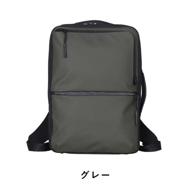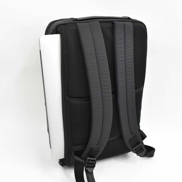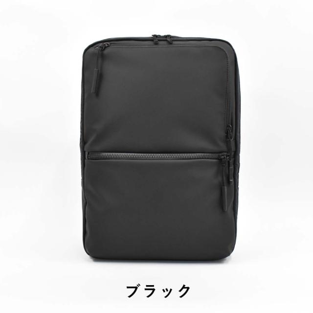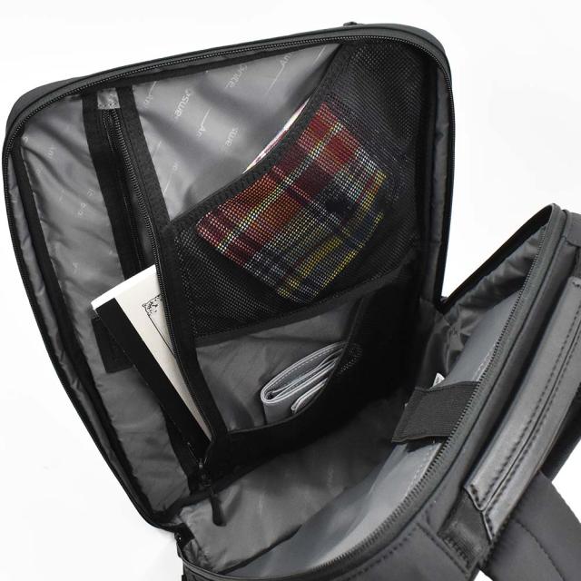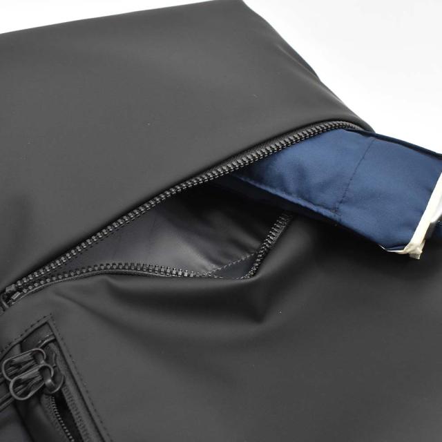 収納部のメッシュポケットは斜めにカットされており、背負いながらでも小物の出し入れが容易に行えます。フロント下部のポケット裏地はPVCコーティングされており、濡れた傘等の一時的な収納に便利。また、 ノートPC収納部には背面ポケットからもアクセス可能です。