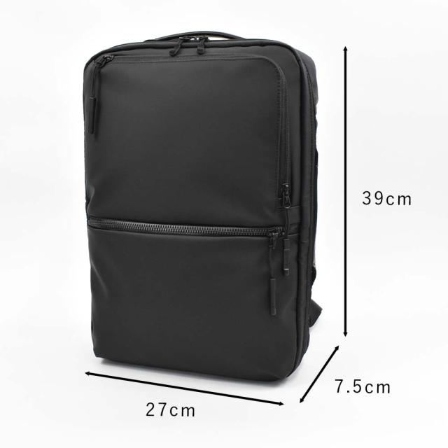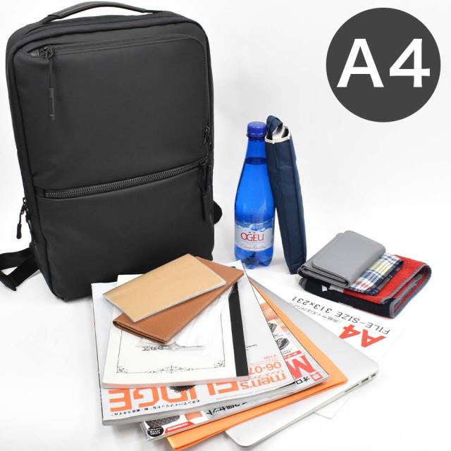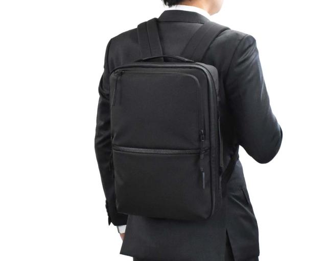 コンパクトなサイズ感ですが、A4ファイルを余裕を持って収納できます。男性だけでなく、女性でも気軽に背負えるバックパックです。