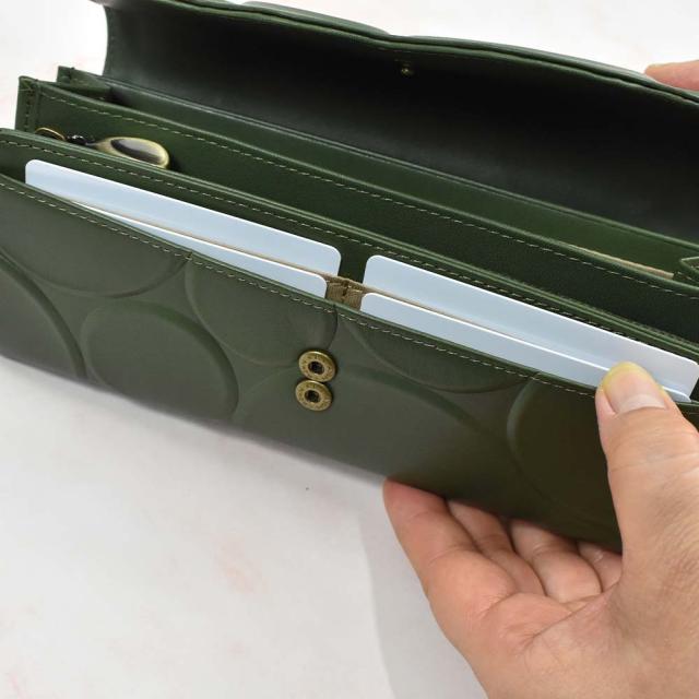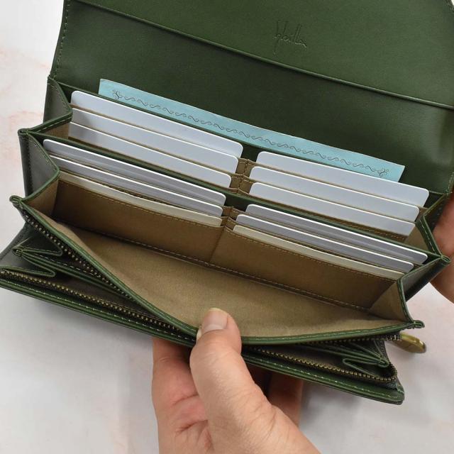 フラップタイプの長財布で、カードが2つの札入れスペース内に12枚、手前のポケットに4枚の計16枚収納可能です。札入れも2か所に分かれているほか、小銭入れはL字ファスナーになっているため、大きく開き、見やすくなっています。