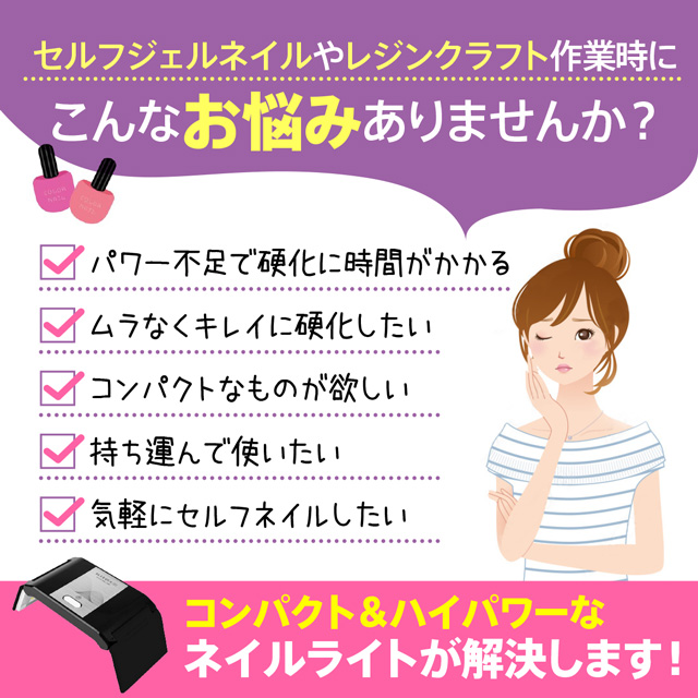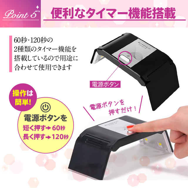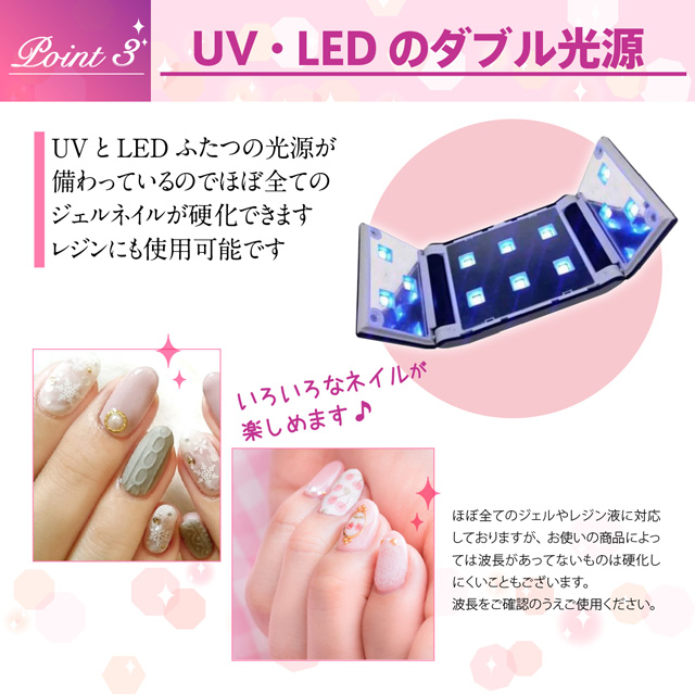 【波長】UVとLEDライトの波長は365+405nmです。 UVネイルライトはUVレジン、UV硬化樹脂、UV接着剤、ジェルネイル用ジェル等幅広くご使用していただけます。 ※ご使用のUVレジンやジェルネイルようのジェルの種類により、硬化時間が異なる場合がございます。未硬化になっている場合は、再び照射してください。