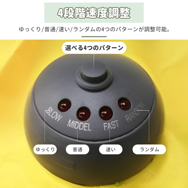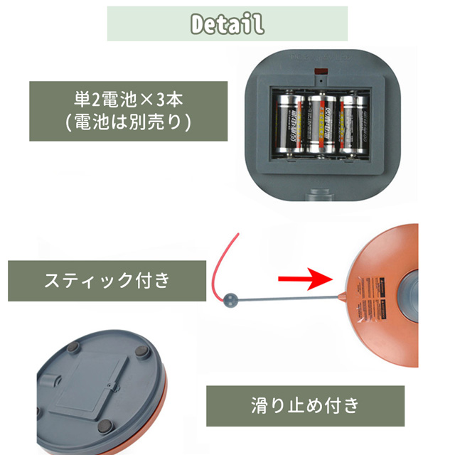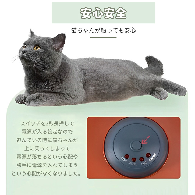 【楽しい4モード、猫ちゃんが大興奮】:低速/中速/高速/ランダムの四つの動きモードがあります、子猫、子犬、成猫、老猫等、様々な猫ちゃんに合うように、豊かを選択しを用意してくれました。自由に選択し、飽きずに遊んでもらえることができます。左方向に回ったり、突然方向転換して、右に回ったりして、猫 遊具が突然スピード変換して、猫ちゃんがスティックの動きを予測できなくてから刺激されて、楽しく狩猟を楽しめます。