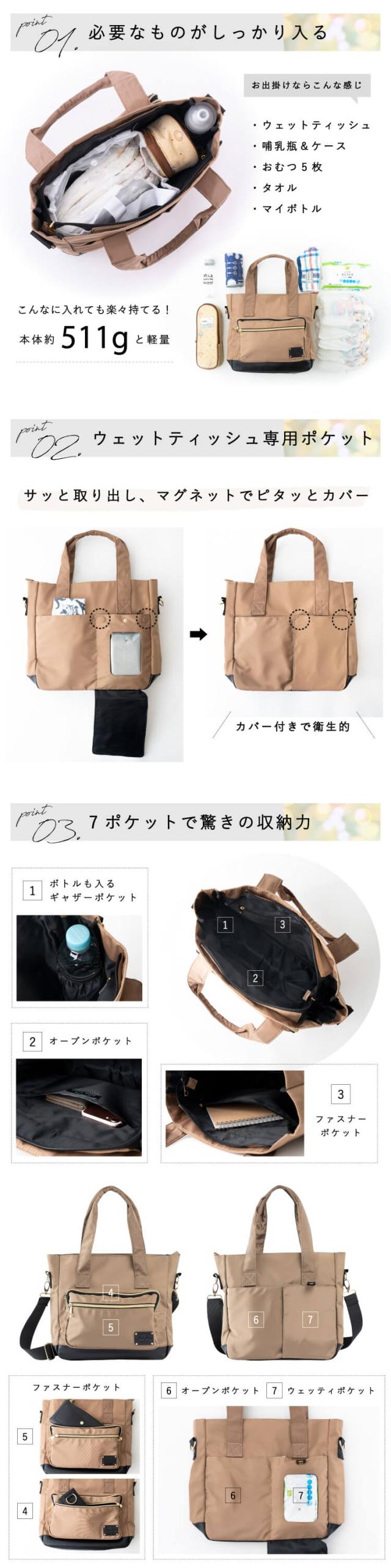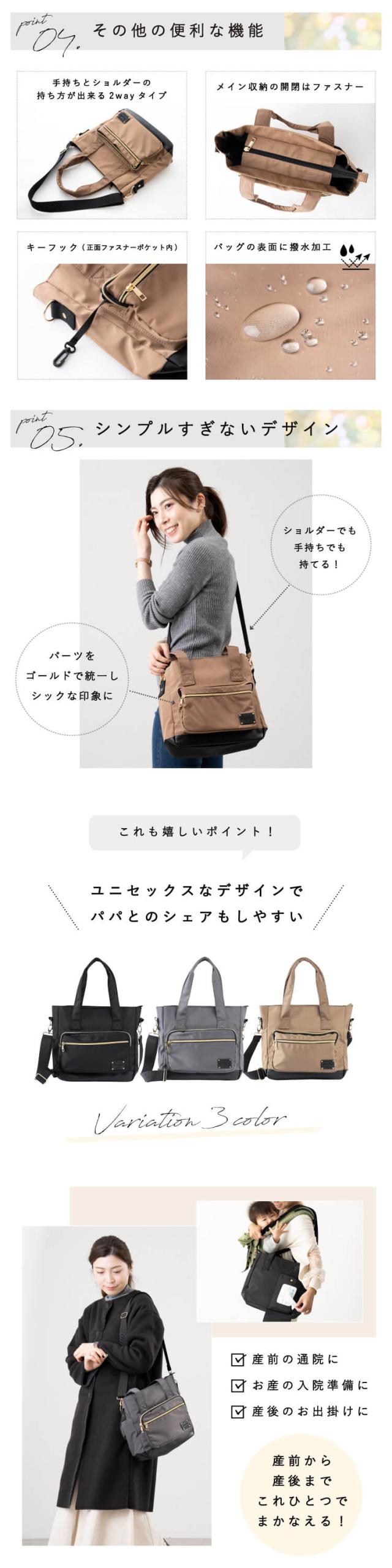 ママが使いやすいデザインを目指した機能的マザーズバッグ。