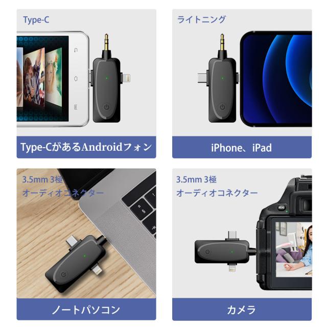 パソコン、Androidフォン、iPhoneやスピーカーの全面対応は素晴らしいです!受信機にて4極3.5mmプラグがあるので、直接パソコンに接続すると使用できます。PCでオンライン会議やオフィスを行うことが全然問題なし!Android&iPhoneアダプターが付属するので、type-cポートがあるAndroidフォンとiPhone/iPadに適用して、気軽に録音または録画を実現できます。