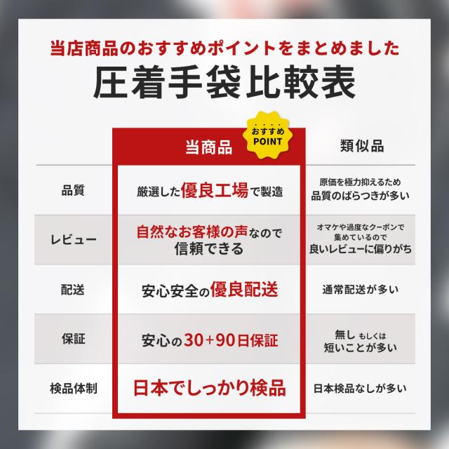 - 今回も早くに届き大変助かりました。 今年に購入の2足分の買い換えで注文しました。 手の負担の軽減の為使用、ほどよい着圧が気に入ってます。 ありがとうございます。