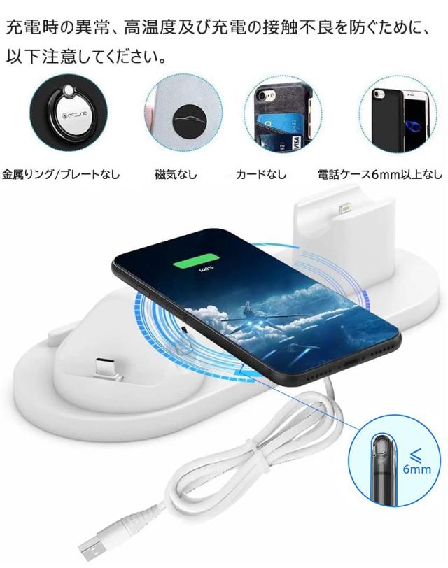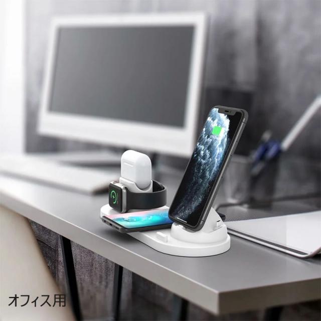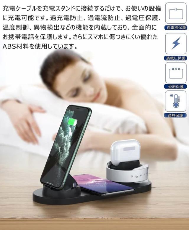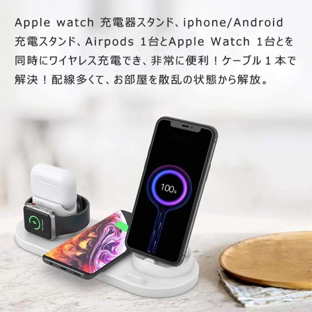 【4in1ワイヤレス充電器】Apple watch 充電器スタンド、iphone/Android 充電スタンド、Airpods 1台とApple Watch 1台とを同時にワイヤレス充電でき、非常に便利!ケーブル1本で解決!配線多くて、お部屋を散乱の状態から解放。