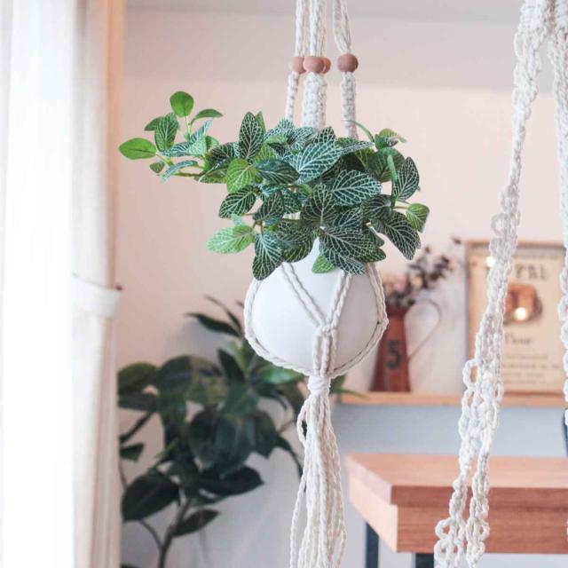 マクラメ編みのプランターハンガーです。天井やカーテンレール、壁掛けフックなどに取り付けて、窓際から植物を吊るしたりしてお部屋を飾ることが出来ます。概ね3〜5号の植木鉢に対応しています。