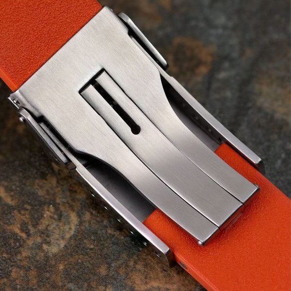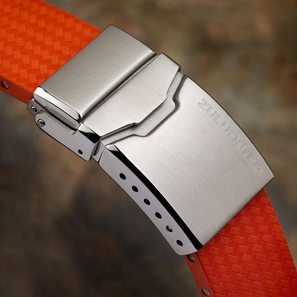 ZULUDIVER(MKII)400シリーズ。セイコーSKX、Fortis Flieger、またはAnonimo Polluce Millimetriなど、さまざまな時計に合わせられる防水性時計ストラップ。スタイリッシュでコンテンポラリーな「カーボンファイバー」処理を施したデザインで、イタリアのBonetto Cinturini社がZULUDIVER仕様に沿って作成。Bonetto Cinturini社は1980年代以来、高級ブランドのラバーストラップを製造しています。バックルはソリッドステンレススチール製、側面はミラーポリッシュ仕上げされ、ZULUDIVERロゴがエンボスされています。6つのマイクロ調整穴が付いたバックルは微調整もでき、お好みの長さに合わせてカットができますので、最大205mm、最小140mmまで調整が可能です。カットしすぎないように、セクションごとに行うことをお勧めします。イタリア北部のBonetto社で作られたこちらのストラップは非アレルギー性のラバーを使用、強度、しなやかさ、快適さ、シンプルさを備えており、また高い防水性、塩水、UVA耐性もあります。リバーシブルですのでテクスチャ変更が簡単にできます。バックル側で2mm先細りになっています。
