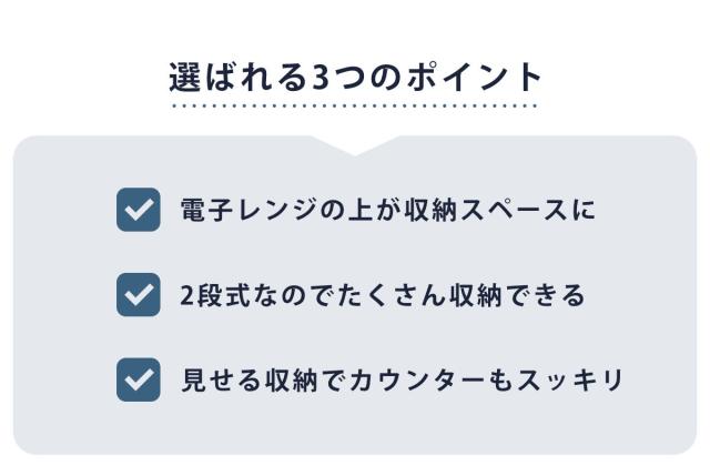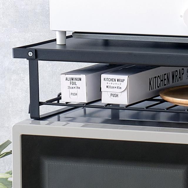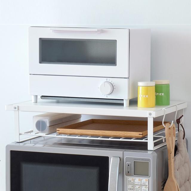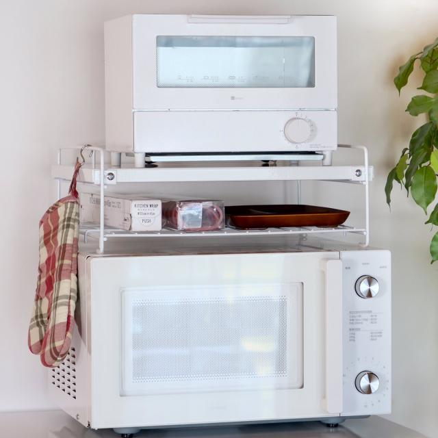 電子レンジの上を収納スペースとして使える、レンジ上ラックです。トースターなどの小型家電製品やキッチンで使うアイテムをスッキリ収納できます。