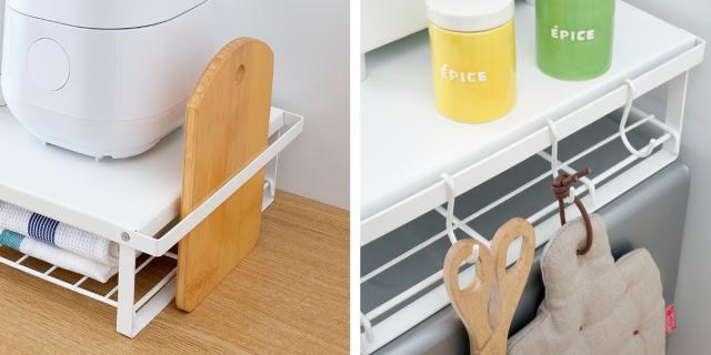 サイドバーには、レシピ本やカッティングボードを立てることもできます。また、S字フックを引っ掛けて小物を吊り下げたり、ケースを引っ掛けたりすれば、さらに収納力がアップします。(※S字フックは付属しておりません)