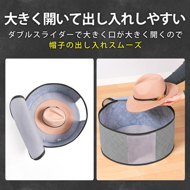 ●ダブルジップファスナーで大きく開くので帽子の出し入れがスムーズ。透明窓付きでケースを開けずに中身の確認ができるので探す手間が省ける。