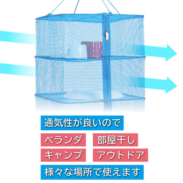 商品名:吊り下げドライネット M 3段カラー:ブルーサイズ:約幅35×奥行35×高さ55ccm材質:ポリエチレン・鉄内容:1個生産国:中国【特長】●バーベキューやキャンプなどのアウトドアの際に便利な吊り下げ干しかご。●屋外で洗った食器などを風通しの良いネットで、虫よけしながら乾かせる。●ダブルスライダーのファスナー式で大きく開くので、出し入れがスムーズ。●使わないときは折りたたむと薄くなるので、かさばらず持ち運びしやすい。●下着、靴下、ハンカチなどの小物などを風で飛ばされずに干すことも可能。【ご注意】●本来の用途以外でのご使用はお控えください。【ASTRO CO., LTD】1970年創業、不織布収納日用品メーカーとして「アストロ」のオリジナル商品を販売しています。生地の開発から製造、流通、品質管理を自社管理。収納用品をメインに多彩な日用品を企画販売してまいりました。アストロは暮らしを楽しく便利にさせる商品をこれからも創造し続けます。established in 1970
