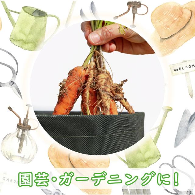 商品名:にんじん栽培 ガーデンポットカラー:グリーンサイズ/約直径30×高さ35cm材質:ポリプロピレン内容:1枚生産国:中国【特長】●通気性と透水性に優れ、熱をポット全体から逃して温度調整し過熱によるダメージから植物を守る。●お部屋の観葉植物鉢カバーとして、園芸用品などの収納BOXとしても。●根菜栽培にも対応できる深さがあり、ジャガイモ、ニンジン、大根などの栽培を楽しむことができ、底穴が開いていないので害虫の侵入を防ぐことができる。●果樹園を根の広がりの制限や、果樹や樹木の植え替えなどに使用できる。【ご注意】●水はけのよい商品のため夏場などは水やりの回数を調節してください。【不織布とは】不織布(ふしょくふ)とは、繊維を糸にして織ったり編んだりせずに、そのままシート状にした「織らない布」のことです。通気性が良くホコリを通しにくい生地のため、衣類や寝具の収納に適しています。アストロではスパンボンド方式で製造されたポリプロピレン製の不織布を主に使用しています。ASTRO CO., LTD established in 1970