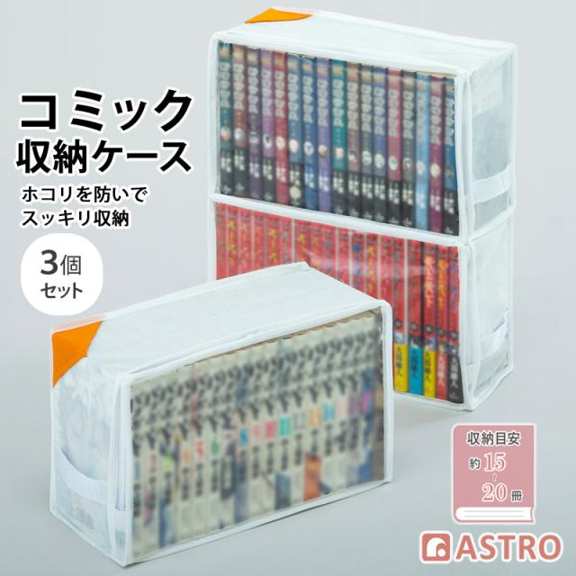 アストロ コミック 収納ケース 3個組 少年 少女 漫画 単行本 新書判 B6判 小B6判 B40判 ホワイト 不織布 コーナーポケット 透明窓 持ち手付き 609-30