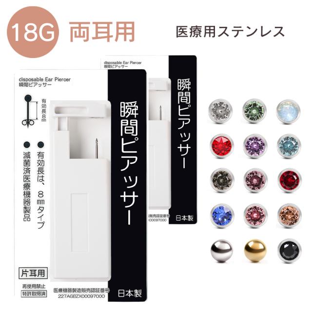 ピアッサー 18G 耳たぶ用 2個セット 両耳用 医療用ステンレス サージカルステンレス 瞬間ピアッサー 金属アレルギー対応 ピアサー 耳用ピアッサー ファーストピアス ピアス 穴開け 穴あけ 18ゲージ つけっぱなし シルバー ゴールド
