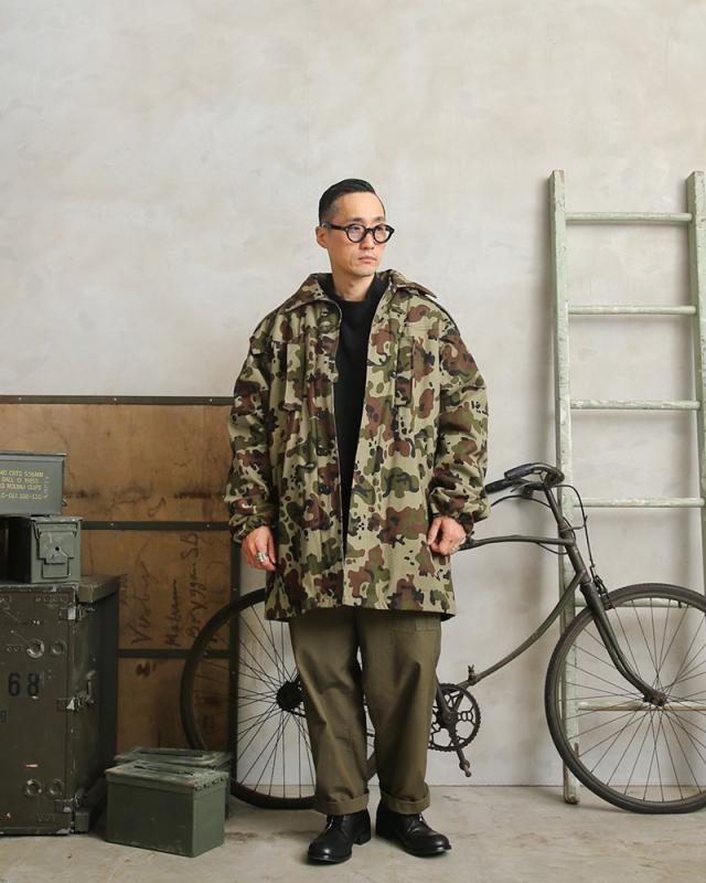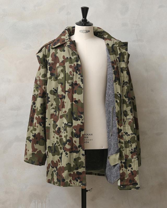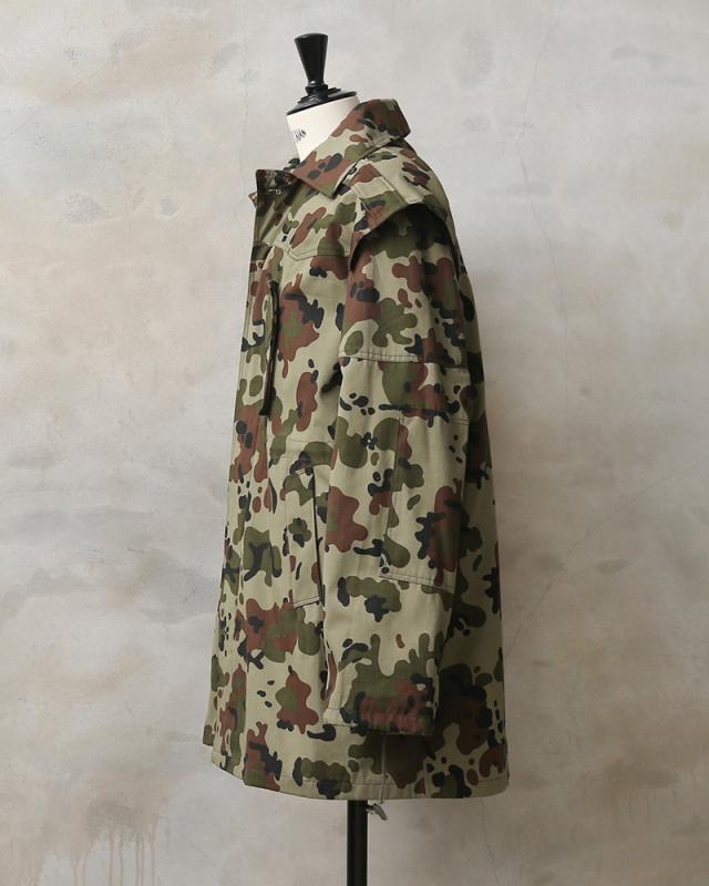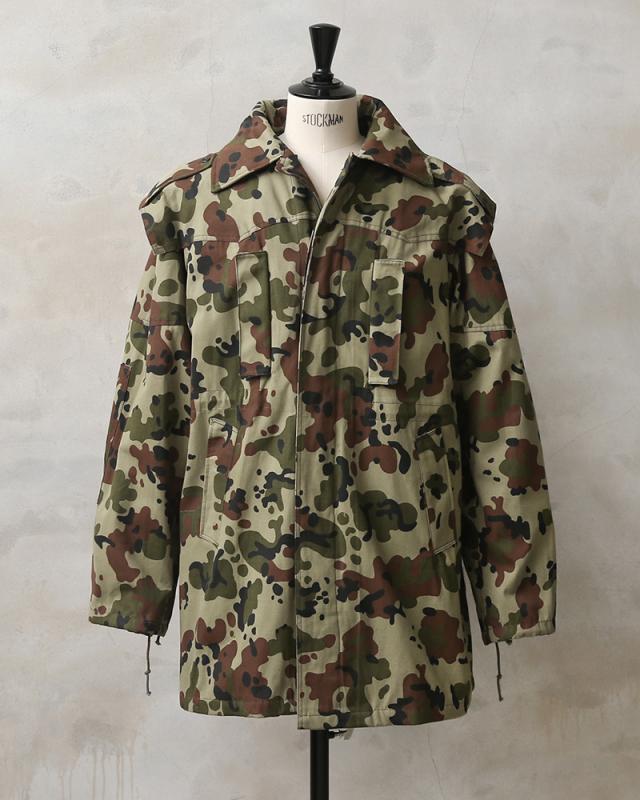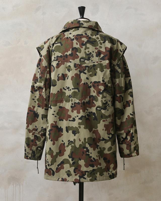 1994年に採用され、ドイツ軍のフレックカモに似ていることからM94フレックカモと呼ばれる2002年まで使用されていた迷彩パターンです。2002年にDPMカモが採用されるまで旧式のM90リーフパターンカモフラージュと合わせて使用されました。生産された年代の違いでライナーの素材なども異なり、迷彩パターンやタグなども異なり様々なバリエーションが存在します。肩のデザインも独特で、ふらし仕立てで肩の生地が独立していることで雨よけなどの効果も期待でき、フードは首元から背面部分に収納可能、胸ポケットは縦型にデザインされています。襟裏にチンストラップ付きで防寒性を高めることができ、襟元にはウィンドフラップ付きで風の侵入を防ぎます。袖やウエストにはコード内蔵で調節可能なルーマニア軍らしい独特なデザインが特徴のフィールドパーカーです。