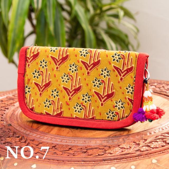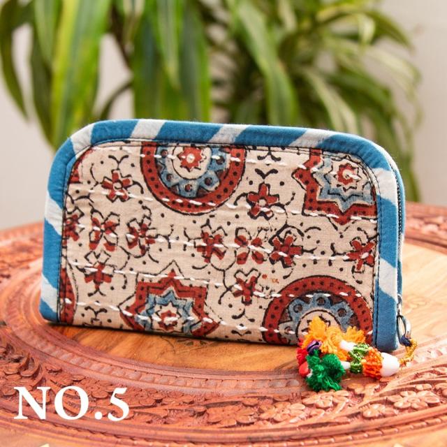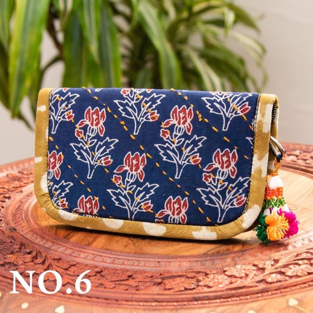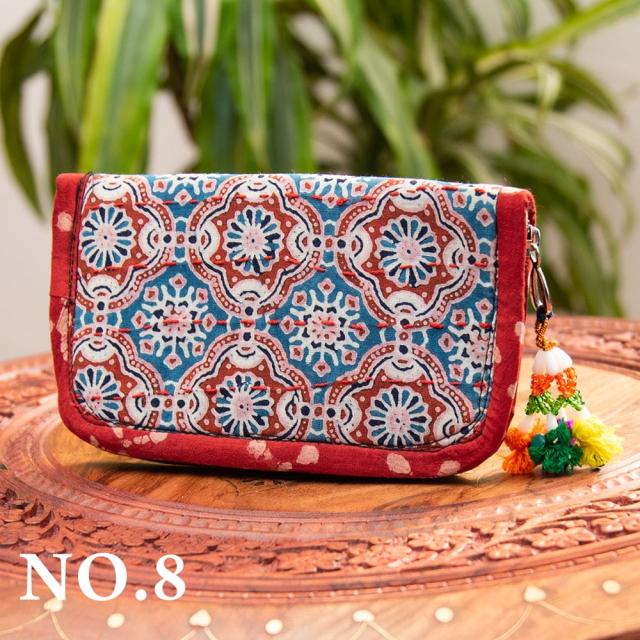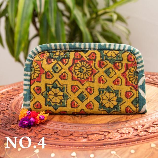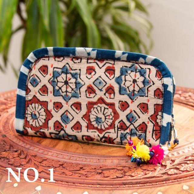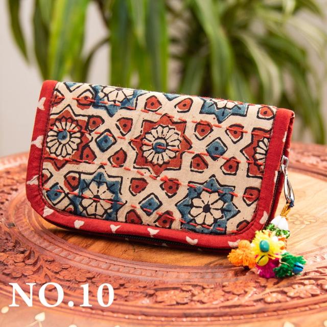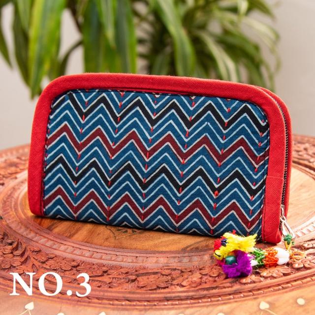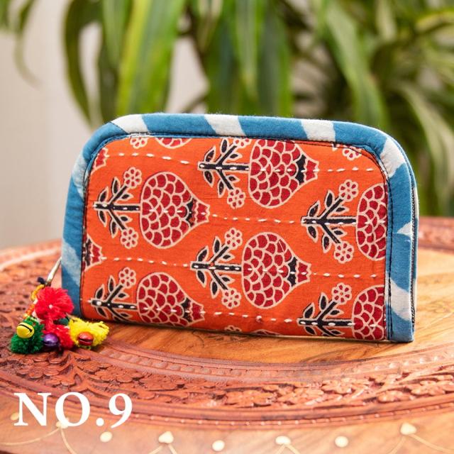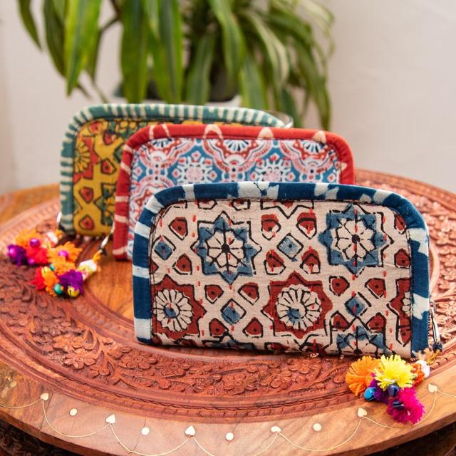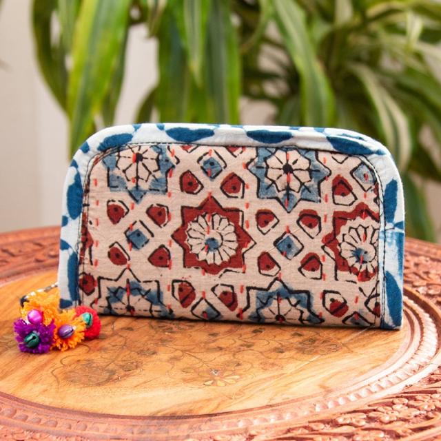 ウッドブロックとカンタ刺繍の伝統染めポーチ 小 ジッパータイプ / 小物入れ ハンドバッグ さいふ クラッチバッグ アジアン レディース エスニック インド