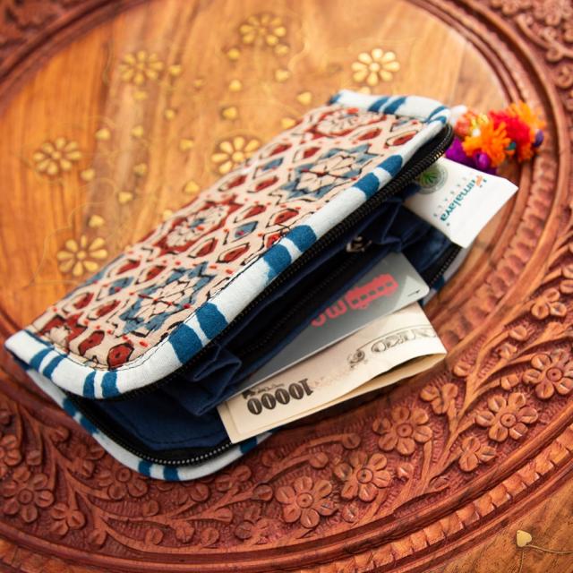 こちらのミニポーチは収納部分はやや小さめの横幅9.5cm程度となっております。収納は3つあり、更に内側に小さなジップ式の小入れがあります。お札を2つ折にして収めたり、カード類、小銭などを入れるのにちょうどいいサイズ感ですね。ちょっとしたお出かけに持ち歩くのに気分が華やぐアイテムです。ジッパーは使い始めはすこし引っかかりがありますのでロウなどでスムースにするのがオススメです。■伝統のウッドブロック布