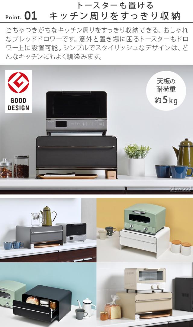 引き出し式で中身がらくらく取り出しやすく、中身のすべり止めや傷つきを防ぐためのクッションシート付き。意外と置き場に困るトースターはブレッドドロワーの上に設置可能です。さらに引き出し下にもスペースがあるため、頻繁に使うトレイやラップ、ランチョンマットやカトラリーケースなど長いものや平たいものの収納にも最適です。ほかにも、取っ手部分にふきんを掛けられたり、本体にマグネットがくっついたりと、うれしい機能がいろいろ。すっきり片付いた後は、使い勝手のよいキッチンに変身するはずです。