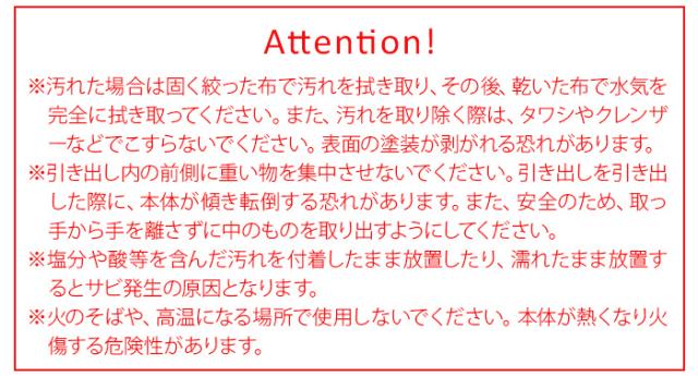 | 汚れた場合は固く絞った布で汚れを拭き取り、その後、乾いた布で水気を完全に拭き取ってください。また、汚れを取り除く際は、タワシやクレンザーなどでこすらないでください。表面の塗装が剥がれる恐れがあります。 引き出し内の前側に重い物を集中させないで下さい。引き出しを引き出した際に、本体が傾き転倒する恐れがあります。また、安全のため、取っ手から手を離さずに中のものを取り出すようにしてください。 塩分や酸等を含んだ汚れを付着したまま放置したり、濡れたまま放置するとサビ発生の原因となります。 火のそばや、高温になる場所で使用しないでください。本体が熱くなり火傷する危険性があります。 こわれやすい物や刃物など、危険な物は入れないでください。 クッションシートの両面には汚れ防止のフィルムが貼ってあります。剥がしてから使用してください。 |