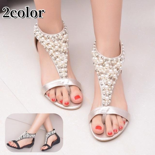 ストラップサンダル ローヒール レディース 女性 靴 フェイクパール ビジュー バッグファスナー トングサンダル シューズ キラ