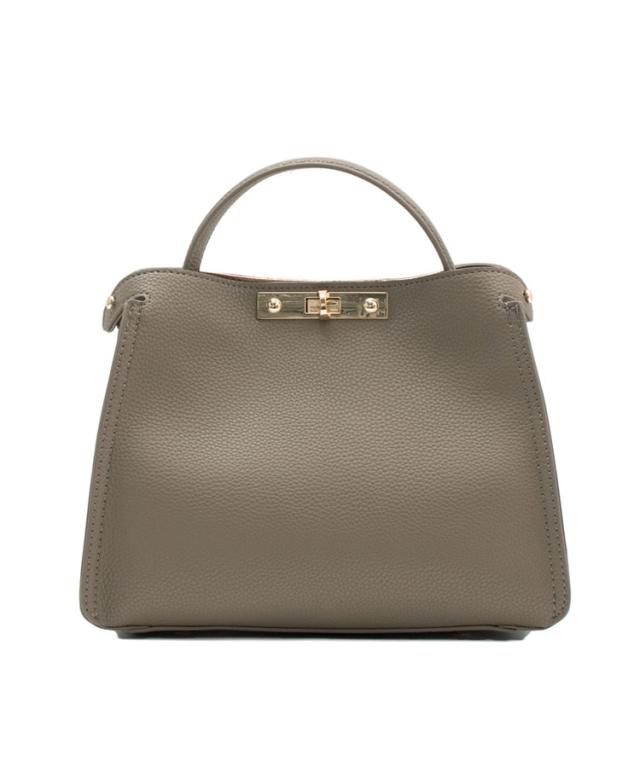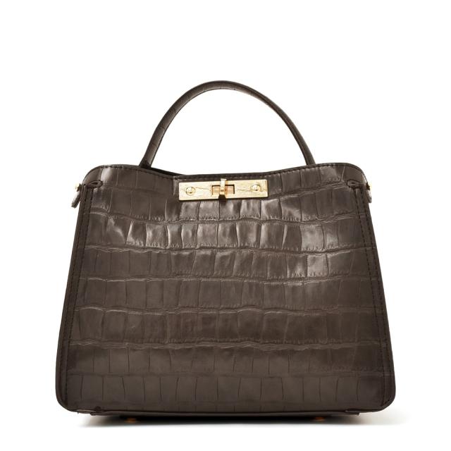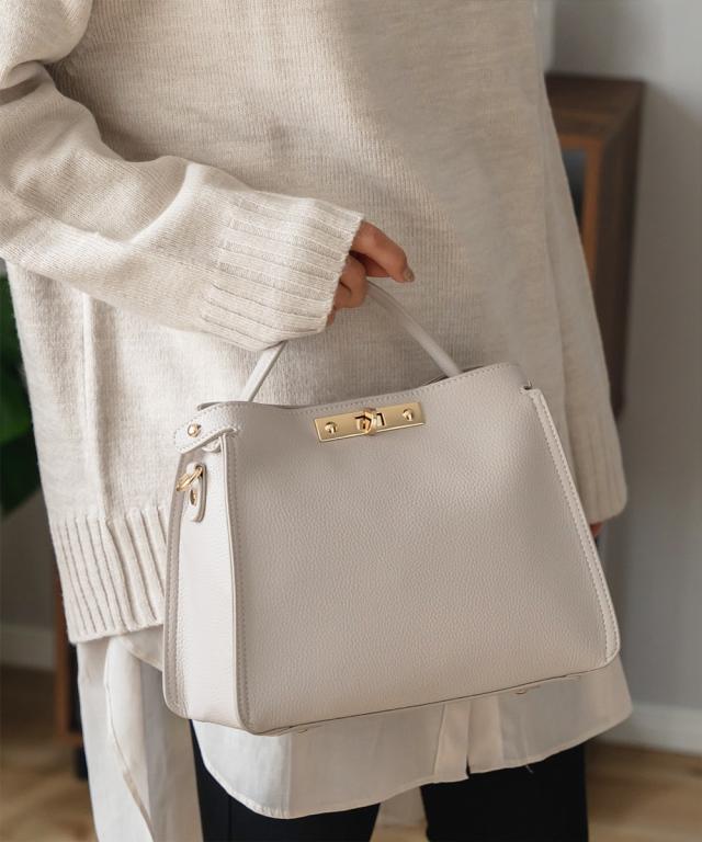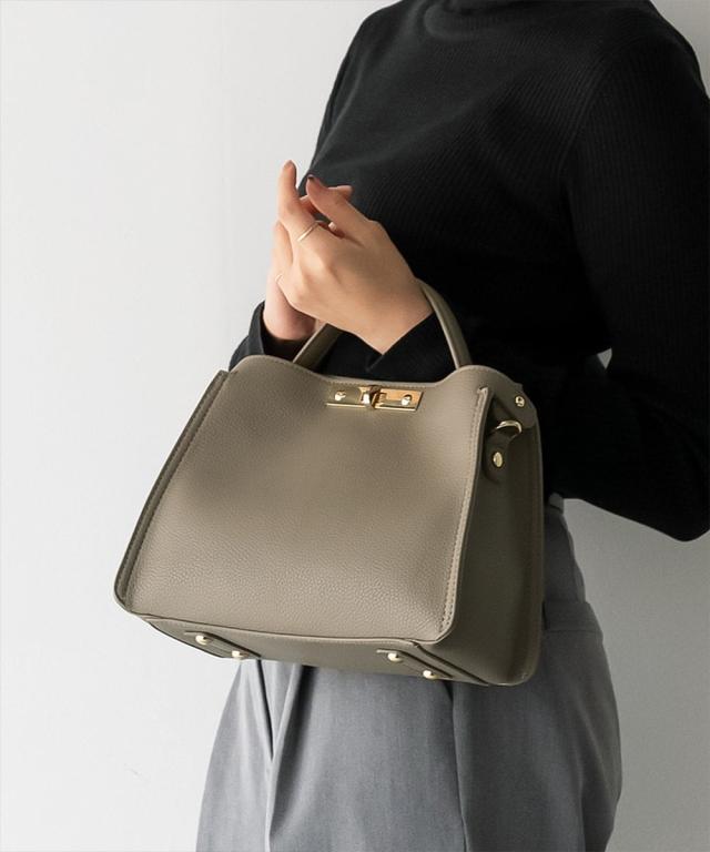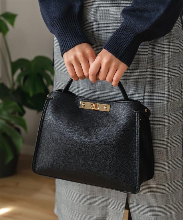 カッチリと四角いシルエットにゴールドの金具が女性らしい印象に。