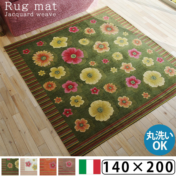 ラグマット 140x200cm 本場イタリアから取り寄せた ジャガード織り 送料無料 おしゃれ 洗える 夏 冬 北欧 洗濯 薄手 床暖房 ホットカーペット対応 インテリア 長方形 花柄 滑り止め付き リビング 絨毯 敷物 カーペット オレンジ ベージュ グリーン ブラウン