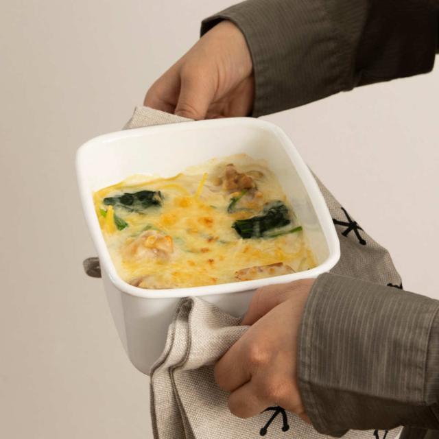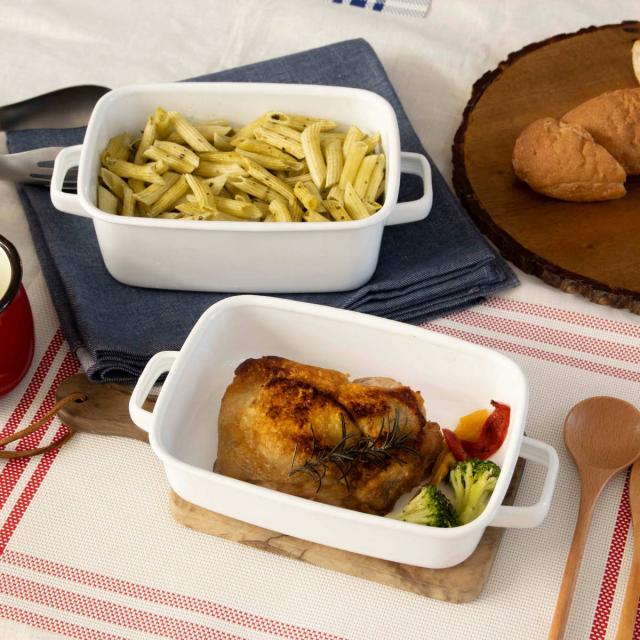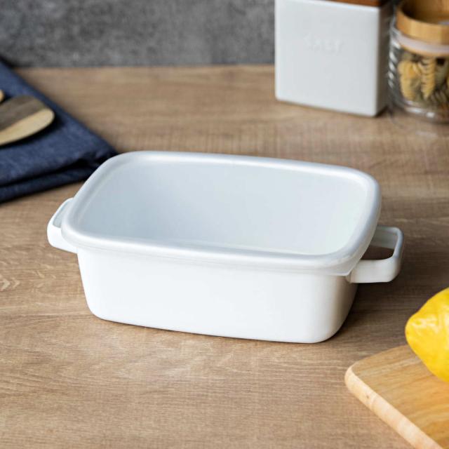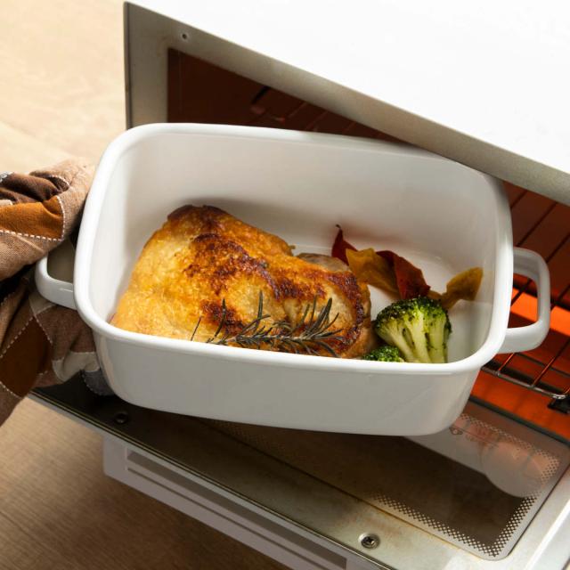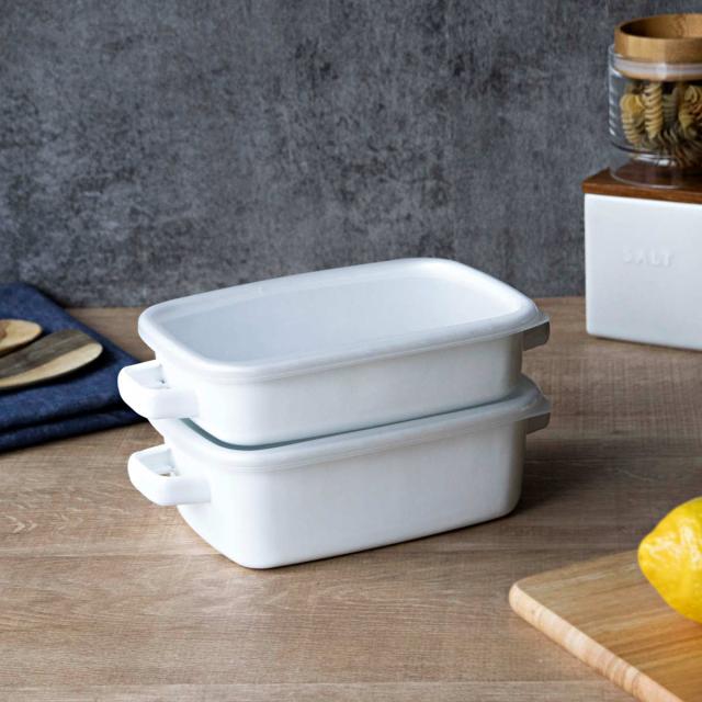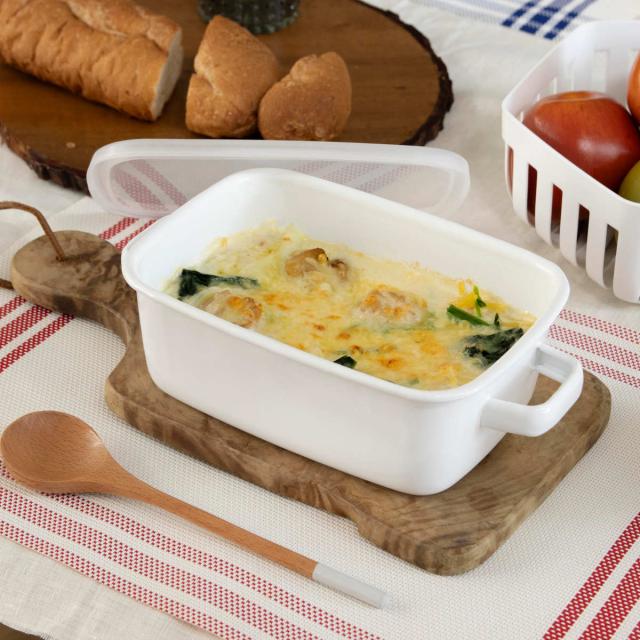 オーブンやトースターで調理したグラタンやラザニアをそのまま食卓へサーブして、出来立て熱々を味わえるホーロー容器です。保温性が高く冷めにくいので、煮込み料理などの温かいお料理の盛り付けにも最適です。作り置き用の保存容器として、オーブン料理の食器として、毎日使いやすいサイズです。