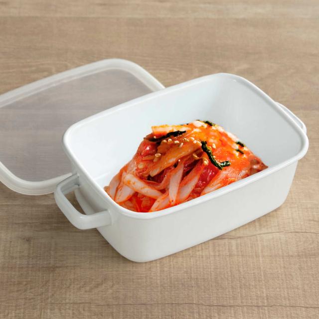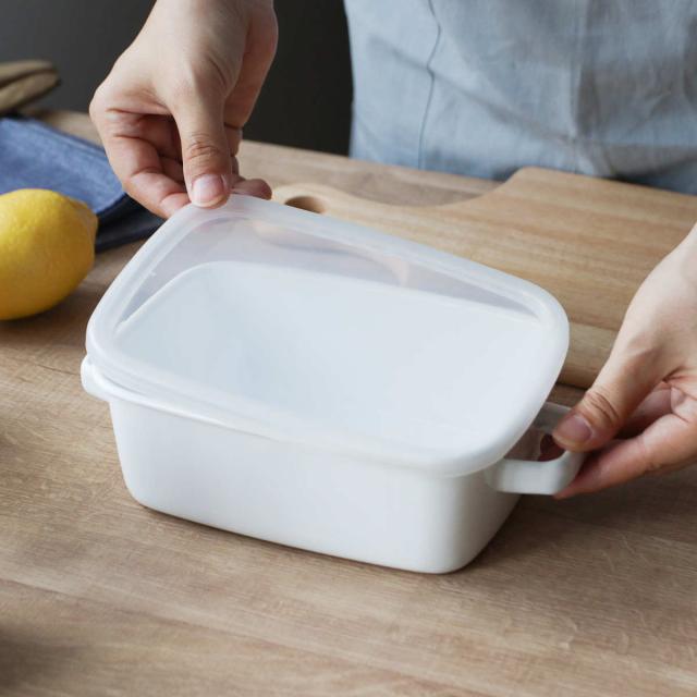 表面はガラス質で艶のある質感のホーロー容器は、酸や塩分に強く、汚れやニオイが付きにくいので、保存する食材を選ばず使用できます。フタ付きだから味噌やキムチなどの発酵食品の保存にもおすすめです。