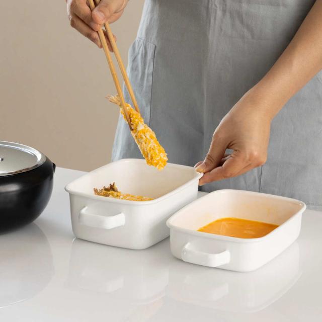 下ごしらえから調理、保存までできる浅型ホーロー容器は、幅広い用途で使用できます。お肉の漬け置きや、小麦粉やパン粉を付けるバットとして使用したり、揚げ物の後に油切りトレーとしても。