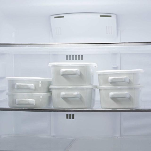 角型の容器はスペースの限られた冷蔵庫にもすっきり収納できます。フタ付きだから食材を入れたままスタッキングが可能です。