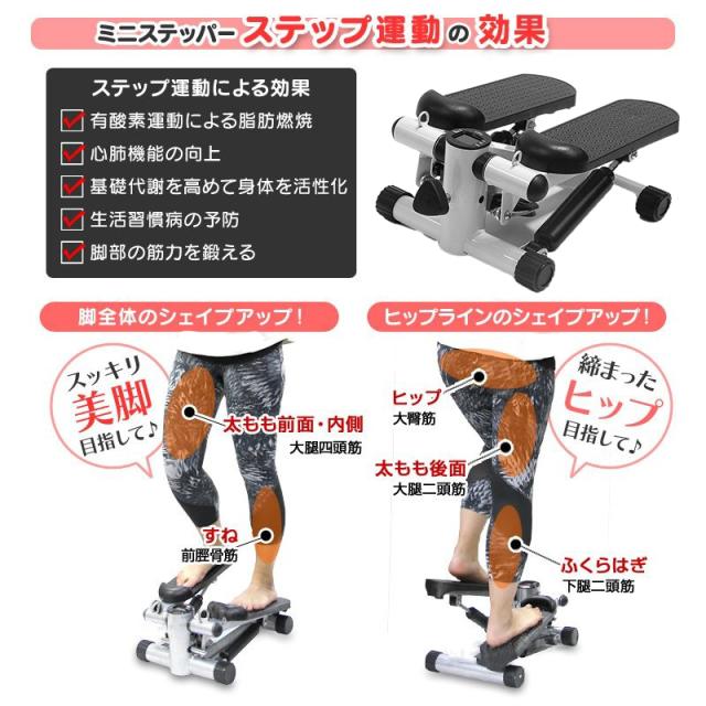 左右でステップをするように上下運動をすることにより、階段登り運動ができ、気になる下半身を引き締め、全身の体力向上にもつながります。