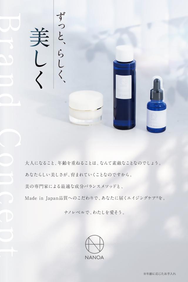 ◆ ビタミンC誘導体を贅沢に配合。 ビタミンのチカラでお肌に潤いとハリを与えます。また3種のセラミド、ヒアルロン酸、プラセンタ、スクワラン、プラセンタエキス、プロテオグリカンを配合し、NANOAは理想的な保湿力にこだわりました。