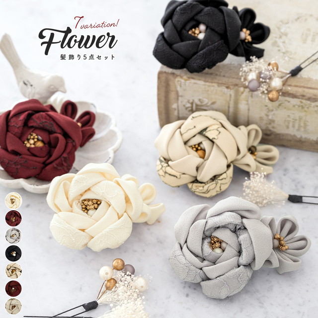 和装のヘアスタイルを彩る、花の髪飾り5点セットです。